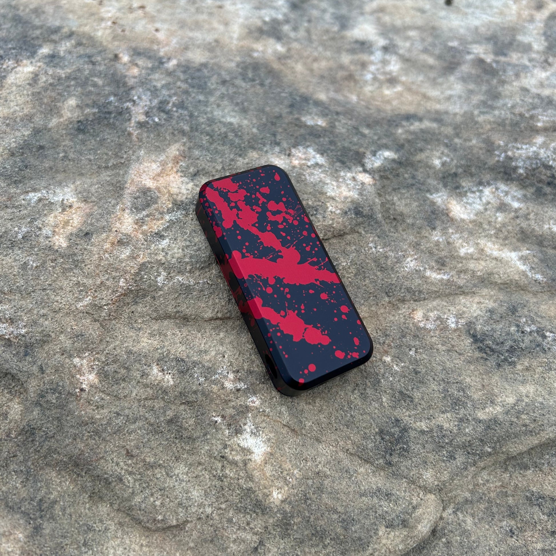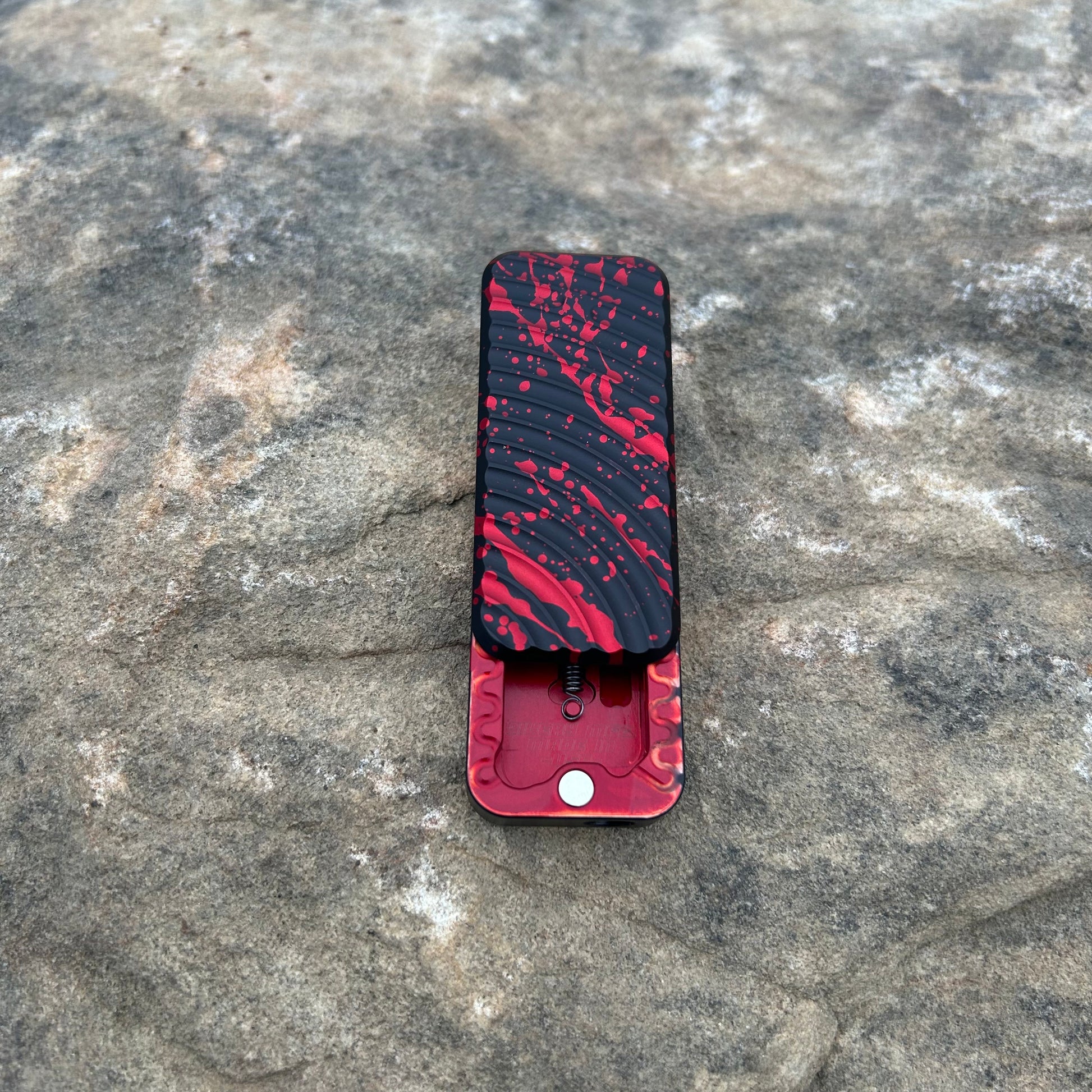 This is a custom anodized Zero in 6061. The finish is a mixture of vibrant colors. Obviously, the proportions matter and with these knives they achieved a beautiful blood spatter pattern effect.